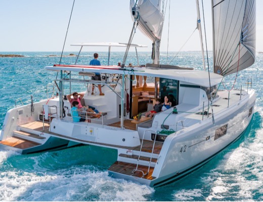 Das mag auf die klassischen Einrümpfer zu treffen. Wir sind aber immer mit Katamaranen unterwegs – dies sind wahre Raumwunder. Neben einem großen Salon bieten sie noch Platz im Cockpit auf dem Sonnendeck und im Netz. Da wir normalerweise Cats ab 45 ft aufwärts chartern bietet sich so schon eine Grundfläche pro Deck von ca. 100qm.